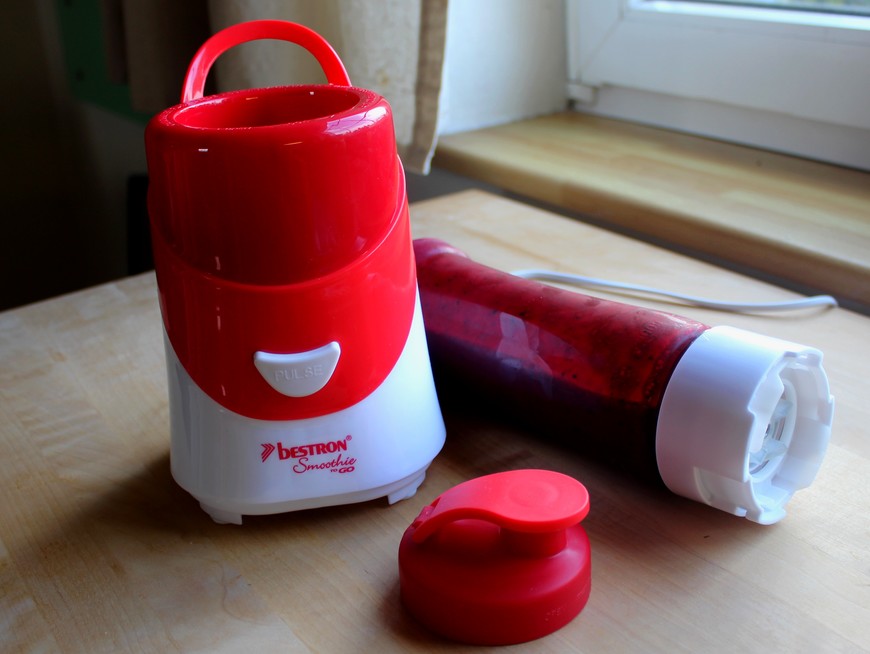 Všechny smoothie jsem vyráběla na už zmíněném „Smoothie to go“ od Bestronu. Tvrdší kousky ovoce je dobré do něj důkladně nakrájet a případně zbavit slupky (hruška, jablko), jinak funguje tak, jak má 🙂 Je skladný,jednoduchý na používání a je fajn, že nádobka na mixování je zároveň přenosná láhev, takže si smoothie nemusíte nikam přelévat, když si ho chcete vzít někam s sebou. No možná proto se to jmenuje Smoothie to go, blik cvak Andy 😀 Jediná nevýhoda je, že láhev nemůžete mýt v myčce. Jsem zvyklá svou láhev na pití z tvrdého plastu normálně mýt v myčce, takže jsem tam automaticky šoupla i tuhle. No, pěkně se mi zkroutila. Naštěstí pořád funguje a do zbytku přístroje ho zacvaknu bez problémů, ale esteticky to není žádná sláva. Na krabici bylo samozřejmě napsané upozornění, že se do myčky strkat nemá, ale všimla jsem si ho pozdě. Takže pozor na to 🙂