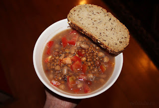 Odpolední svačinu vyřešila čtvrtka pomela a večeři hotová luštěninová polévka z plechovky, do které jsem jenom přikrájela rajčata a přikusovala chleba. Polévku jsem koupila v Delmartu, byla od značky Annalisa a byla naprosto skvělá! (#nopromo:D) Myslím, že byla myšlená na dvě porce, ale já snědla tak dvě třetiny.