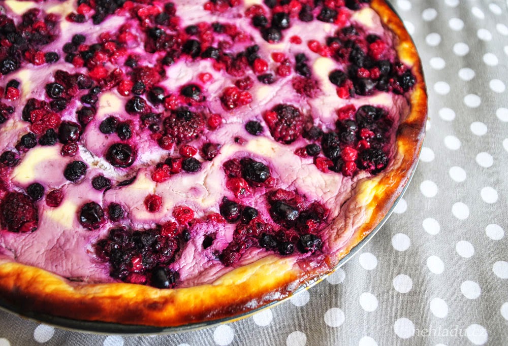 Dejte péct na stejnou teplotu na 20 minut. Poté na koláč nasypte ovoce – je to proto, aby se hned neponořilo do tvarohu.